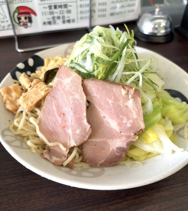 つけ麺本体は、真ん中にネギの細切りがこんもりと盛られていて、キャベツとチャーシューと「?」な食材で麺を取り囲む盛り付け。