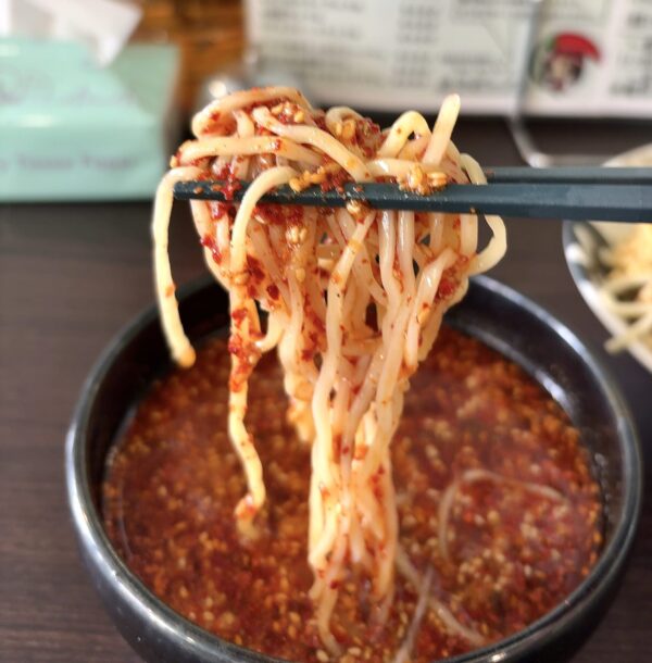 ツユには赤と朱色の粉が浮かんでいて、いかにも辛そう。
